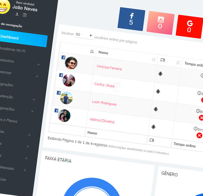 Você pode por exemplo, criar promoções para os aniversariantes do mês, enviar mensagens como SMS e WhatsApp convidando o cliente a visitar seu negócio, oferecer segurança no acesso à internet no seu estabelecimento e exibir imagens, texto, cardápio e vídeos ao cliente se conectar!